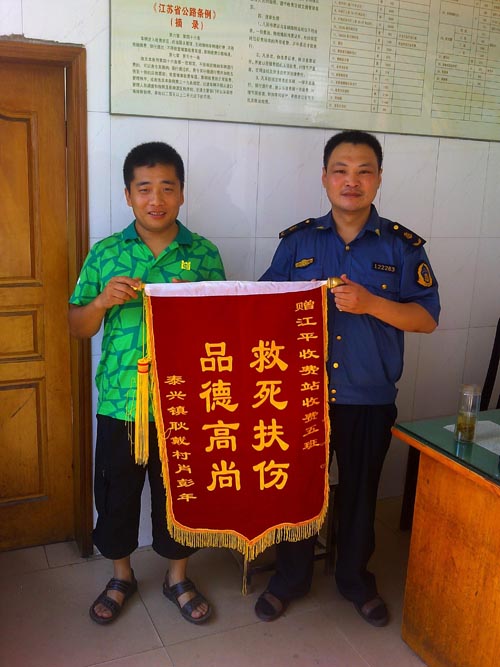 (通讯员 殷剑锋) 9月2日上午,江平线泰兴口岸收费站班组值班室门前锣声震天、鞭炮齐鸣,引得过往行人纷纷驻足观望。原来,这是家住泰兴镇耿戴村的驾驶员肖彭年为感谢收费站职工几天之前的倾力相助,特地为他们赠送锦旗来了。 事发8月31日上午9点半左右。当时,肖某驾驶车号为苏1255428的手扶拖拉机,载着一名同伴由北向南通过收费站后,因速度过快、操作失当,车辆突然在翘头后发生了侧翻。慌乱中,肖某及同伴顾不上调整方向,只死死拽住车头不放,并大声向周围呼救;而车辆则在惯性作用下,逐渐向公路西侧的防护坡方向滑去——防护坡下,是农民群众挖设的一条深水渠道,一旦落入其中,后果将不堪设想! 千钧一发之际,正在收费区南侧打扫卫生的收费五班班长刘咏峰发现这一状况后,连忙扔下扫帚,带领几名工作人员火速奔到了事发现场。此时,车辆的头部已然悬空,并有进一步下滑的趋势,形势可谓岌岌可危。面对险情,刘咏峰临危不乱,他一边迅速组织和号召几名工作人员及过往群众拖住车辆尾部,防止其进一步下滑,一边和另一名工作人员相互拉扶着,从防护坡上小心探步至车辆驾驶室附近,将肖某及其同伴一一救了上来。随后,现场人员又几经努力,使车辆处在了一种“准静止”的状态上。约一刻钟后,工作人员帮肖某联系的吊车及时到达了现场,最终将车辆成功“拖上了岸”。 事故化险为夷后,惊魂甫定的肖某几次欲拿出现金予以酬谢,但均被刘咏峰等人一一婉拒。数日后,肖某再次特地赶至收费站,送来了一面写有“救死扶伤,品德高尚”的锦旗,以表他对该站职工的诚挚谢意。 |
