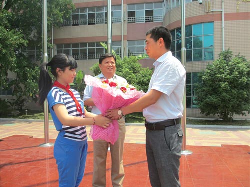 谢兵在事发现场接受当地媒体采访 看到跳河女开始大口吐出呛进去的河水,浑身湿透的谢兵掕起自己的鞋子上了车,不声不响地离开了现场。 被救的妇女姓李,在大生社区开了一家小吃店,因为生活琐事,一时想不开跳河轻生。事后,她对自己的鲁莽行为后悔不已,同时也对救命恩人的义举感激零涕:“要不是这个好心人,说不定这个时候都送到火葬场了。” 绝非偶然,英雄从小乐于助人 “那条河三米多深呢,根本踩不到底啊,救人的这个小伙子真的不简单。”当时在桥上拼命呼救的鞠女士感慨地说。但是这个小伙子是谁? 事发后,附近的大生小学老师朱振东也赶到了现场。“小伙子好像是谁家的女婿……”、“他的岳父就在附近的通江路上做钢材生意。”“他好像是个老师,他的车子是宝马X3”。朱振东综合这些信息,四处打听小伙子的姓名和单位,最终通过他调到鼓楼小学的同事熊立新,查证了这个救人英雄就是泰兴市鼓楼小学体育教师谢兵。 “作为一名社会公民,同时作为一名人民教师,谢兵路遇险情,舍己救人,我们觉得绝非偶然,这与他的自身素质有着密切的关系。”面对社会各界的赞誉,泰兴市鼓楼小学校长姚恒章如是说。