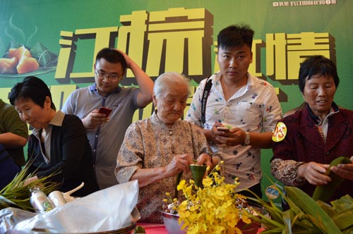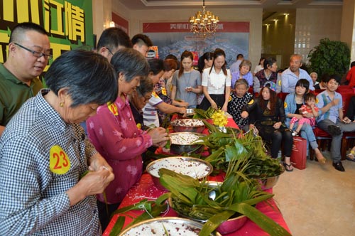参赛选手5人一组,每人必须完成6只粽子,包得又快又好的选手胜出。参赛选手大多是新近入住虹桥新城的动迁群众,包粽子自然是他们的拿手好戏。其中一位年轻帅气的小伙子,在女友的鼓励下勇敢参赛,并夺得小组第三名;现场一位90高龄的老奶奶更是英勇不减当年,动作娴熟,沉着冷静,让现场观众大为叹服。