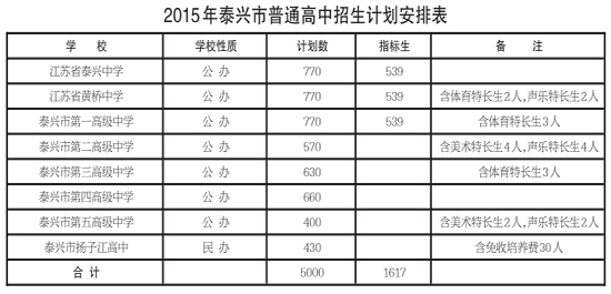 (记者 张宏伟 通讯员 王浩)5月24日,记者从市教育局获悉,根据泰州市教育局、泰州市发展和改革委员会《关于下达泰州市2015年普通高中和中等职业教育招生计划的通知》(泰教发〔2015〕4号)精神,我市2015年江苏省泰兴中学、江苏省黄桥中学、泰兴市第一高级中学、泰兴市第二高级中学、泰兴市第三高级中学、泰兴市第四高级中学、泰兴市第五高级中学、泰兴市扬子江高中8所普通高中累计招生5000人,其中指标生1617人。未下达招生计划的学校不具备普通高中招生资格。(具体计划见表) 另据了解,今年我市共有9443人参加中考,全市设37个考点,333个考场。考试将于6月15日至6月17日举行。 |