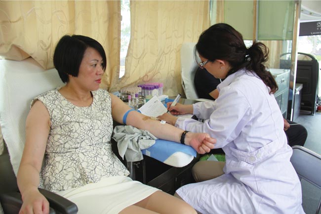 6月14日是第十三个世界献血者日,主题是“血液连接你我他”。据了解,当天有80多名市民现场参与无偿献血行动。图为流动献血车上,一名义务献血者正在献血。
