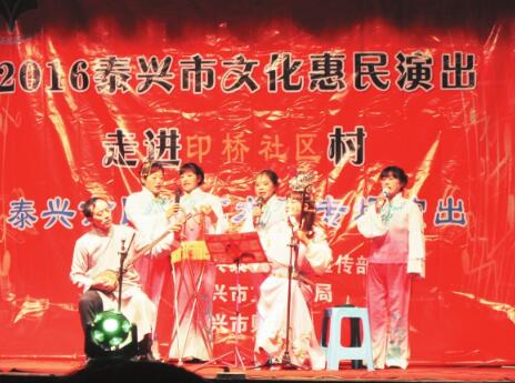 日前,市民间艺术团在滨江镇印桥小区开展惠民演出活动,歌舞、独唱、黄梅戏、泰兴花鼓等喜闻乐见、丰富多彩的文艺节目赢得了台下近千名观众的阵阵掌声。据了解,市民间艺术团积极开展文艺惠民活动,今年8月份以来,先后赴广陵、古溪、分界、张桥、元竹、宣堡、曲霞等乡镇开展演出活动,受到社会好评。