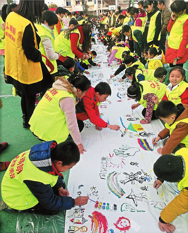 12月3日,由市大庆路小学主办,市晴朗社会工作服务中心、晴朗金话筒少儿主持和樊登读书会泰州分会等单位参与的“和未来有约”大型公益活动成功举办,吸引了近600名学生和家长现场参与。图为孩子们在近50米长的横幅上用画笔畅想自己的美好未来。