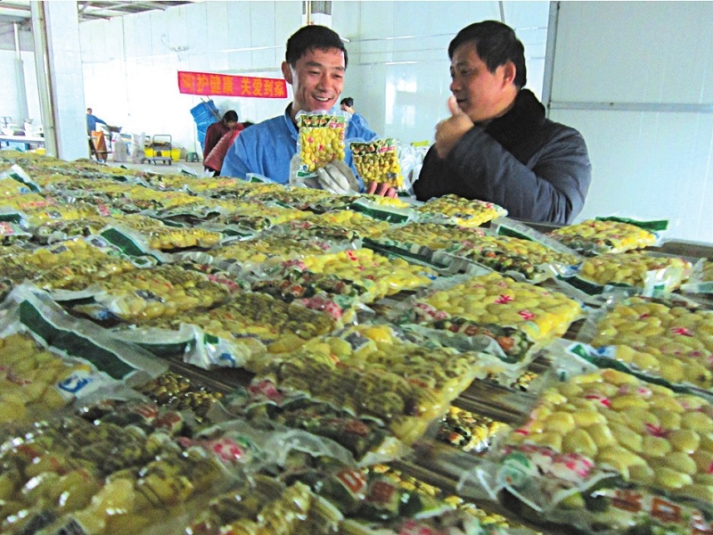 10月下旬以来,白果陆续上市,但果价仍在低谷徘徊。目前,一斤白果仍卖不上半斤青菜价,果农怨声载道。华尔康生物制品有限公司抢抓商机,敞开收购白果。图为脱壳保鲜果仁。