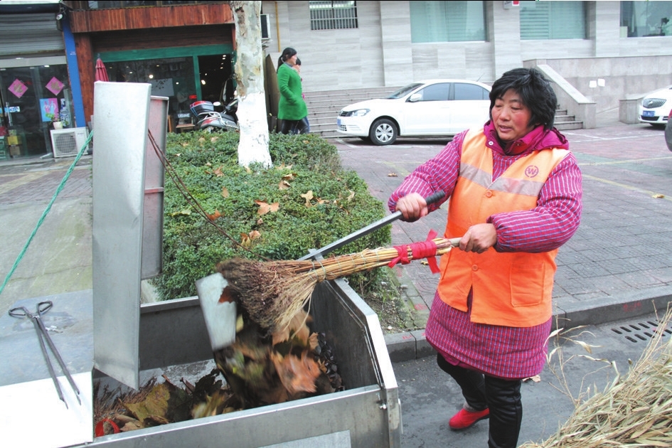 落叶迎风飞舞 环卫工人更忙