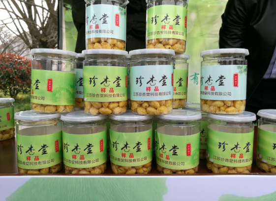 活动现场,各种泰兴传统美食让游客应接不暇,有宣堡小馄饨、宣堡生姜丝、黄桥烧饼、银杏酱、银杏酒、银杏奶茶等。游客王青说:“这个银杏酒确实不错,它是银杏蒸熟了之后,沉淀发酵做的,酿一瓶酒大概需要两年。我爸爸喜欢这个酒,所以今天带两瓶回去。” 尝过传统美食,新兴的银杏深加工产品也吸引了不少游客,珍杏堂科技有限公司负责人李东红发明的银杏生剥技术,去年获得国家专利,今天展销的就是他们公司的银杏脆果、银杏饼干等产品。李东红说:“传统的银杏加工需要人工剥壳然后蒸熟,我们采用银杏的生加工技术,包括机械化去壳去芯,较好地保留了有效成分。今天来关注我们的人挺多,一旦我们的产品拓宽了,会给泰兴银杏果农带来实际的利益。”