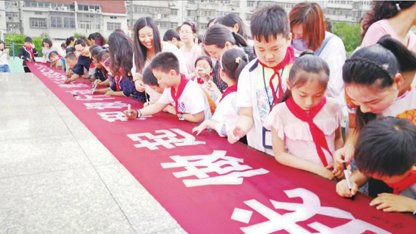 6月14日上午,市襟江小学举行“小手拉大手,共建卫生城”主题宣传启动仪式。活动中,学生代表宣读创卫倡议书,家长代表和学生代表在“从我做起,积极行动,携手共创国家卫生城市”横幅上签字。该校校长黄敬统说:“让小学生参与这项活动,首先帮着爸爸妈妈搞好家庭卫生,同时要搞好社区的卫生,还要宣传健康生活的理念,将创卫工作通过我们小朋友的宣传行动推向一个新高度。”记者 王姝文 摄