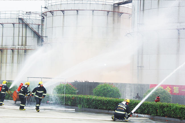 6月21日下午,虹桥工业园区举办2017年度夏季安全、环境突发事故应急救援预案演练。演练内容是因甲苯储罐泄漏且抢修时操作不当产生明火引发火灾,公司立即启动安全、环境突发事故应急救援预案,对现场险情进行控制和扑救。近1小时后,演练活动圆满结束。