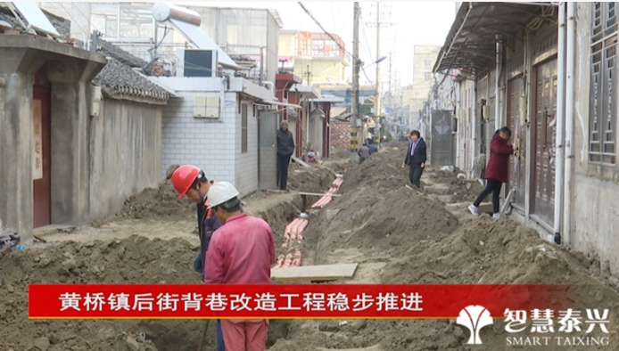 12月5日上午,在黄桥镇东进东路北侧的巷子里, 施工人员正在铺设燃气、污水、弱电、自来水管道。