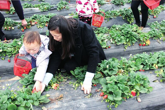 连日来,春光融融,不少市民不负春天好光景,外出游玩。记者在位于黄桥镇的润佳草莓园看到,一个个大棚里草莓鲜红欲滴,不少游客前来采摘草莓。采摘草莓的大多数是一个个家庭,小朋友手提篮子家长在旁边指导并给小朋友拍照。草莓园主人介绍,这段时间草莓产量大,前来采摘草莓的游客多,周末更多。