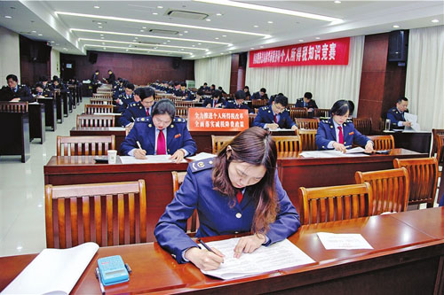 (记者 周冰 通讯员 王婷 摄)日前,市税务局组织100多名税务干部参加新个人所得税法知识技能竞赛,推动税务干部尽快掌握个税改革相关业务知识,夯实业务基础,保障个税改革政策落到实处。此次竞赛采取闭卷考试的方法,邀请个税专家出考卷,并由该局纪检部门负责全程监督,并邀请广大市民和纳税人广泛参与知识竞赛,进一步扩大新政知晓面、落实面,确保竞赛公平、公开、公正。