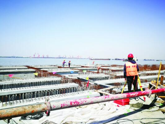 泰州港泰兴港区七圩作业区公用码头工程,由中铁建港航局集团与我市合作共建,项目总投资12.49亿元,包括1个70000吨级散货泊位、1个40000吨级件杂货泊位、1个10000吨级件杂货泊位以及陆域堆场及配套设施,年设计吞吐量605万吨。今年3月28日,码头平台开始浇筑第1榀下横梁,到4月28日仅完成27榀,此时下横梁施工受长江水位上涨的影响已经很大,每天有效作业时间仅有3-4小时。