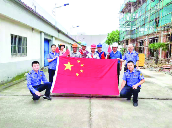 ![]() 市城市管理综合执法大队的队员们来到建筑工地,和建筑工人们一起与国旗合影。