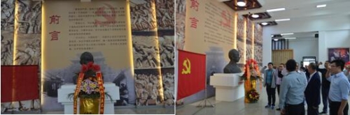 在纪念馆瞻仰厅,全体人员瞻仰了泰兴县委第一任书记沈毅烈士铜像。沈毅为泰州人,1925年,25岁的他来到刁家网,在刁家网地区点燃革命星火。从此,“要找共产党,就到刁家网”在人民群众中广为流传。1928年,28岁的沈毅没有逃脱敌人的追捕,光荣就义,永远地离开了刁家网,但是他留下的革命火种却一直在燃烧。此后,历经土地革命、抗日战争和解放战争,中共泰兴县委先后有力地支援了黄桥决战和以黄桥为中心的苏中抗日民主根据地建设,配合华中野战军取得了彪炳军史的苏中七战七捷,最终获得了泰兴全境解放。