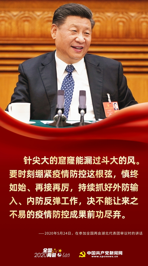 1月25日,中央政治局常委会会议决定,党中央向湖北等疫情严重地区派出指导组,推动有关地方全面加强防控一线工作。 “指导组有什么情况、有任何需要,可以打电话直接和我说。”习近平日夜牵挂湖北、武汉的疫情,对中央指导组先后作出上百次重要指示,为有效指导疫情防控提供了根本遵循。 如今,经过艰苦卓绝的努力,武汉保卫战、湖北保卫战取得了决定性成果。但当前,境外疫情扩散蔓延势头仍然没有得到有效遏制,国内个别地区聚集性疫情仍然存在,湖北有时还出现散发零星确诊病例。 大考仍在继续。 “针尖大的窟窿能漏过斗大的风。”在湖北代表团审议现场,习近平强调,要时刻绷紧疫情防控这根弦,慎终如始、再接再厉,持续抓好外防输入、内防反弹工作,决不能让来之不易的疫情防控成果前功尽弃。 “我们以人民为中心、生命至上。这次战疫考验着各级党委政府和广大党员的政治品格和能力作风。”习近平指出,“现在湖北各方面工作任务很重、困难很多,但是我们比较一下疫情突发阶段所遇到的困难,目前的困难应该说不算什么了。” 习近平总书记叮嘱湖北广大党员干部,要紧紧依靠人民,发扬在疫情防控斗争中展现的精神面貌,真抓实干,奋力拼搏,要坚决反对形式主义、官僚主义,敢于负责、敢于斗争、敢于克服困难去取得新的更大的胜利。 “经历了这场磨难的湖北、武汉一定能够浴火重生”