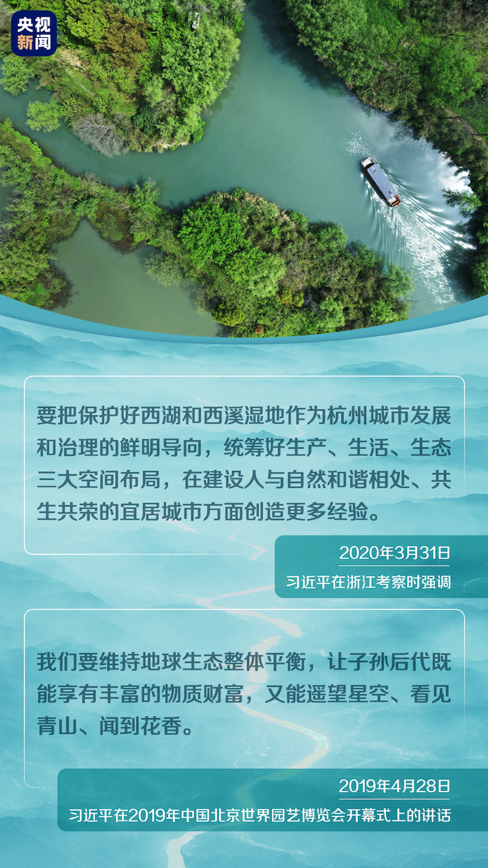 ▲2020年3月31日,习近平在浙江杭州西溪国家湿地公园察看湿地保护利用情况。 杭州西溪国家湿地公园是全国首个国家湿地公园。3月31日,习近平总书记在杭州考察的第一站就来到这里,沿着绿堤、福堤,察看湿地保护利用情况。总书记指出,湿地贵在原生态,原生态是旅游的资本,发展旅游不能牺牲生态环境,不能搞过度商业化开发,不能搞一些影响生态环境的建筑,更不能搞私人会所,让公园成为人民群众共享的绿色空间。 习近平对城市湿地的关注和保护,体现了他对城市发展方向的把握,对人与自然和谐共生的坚持,对人民利益的重视。