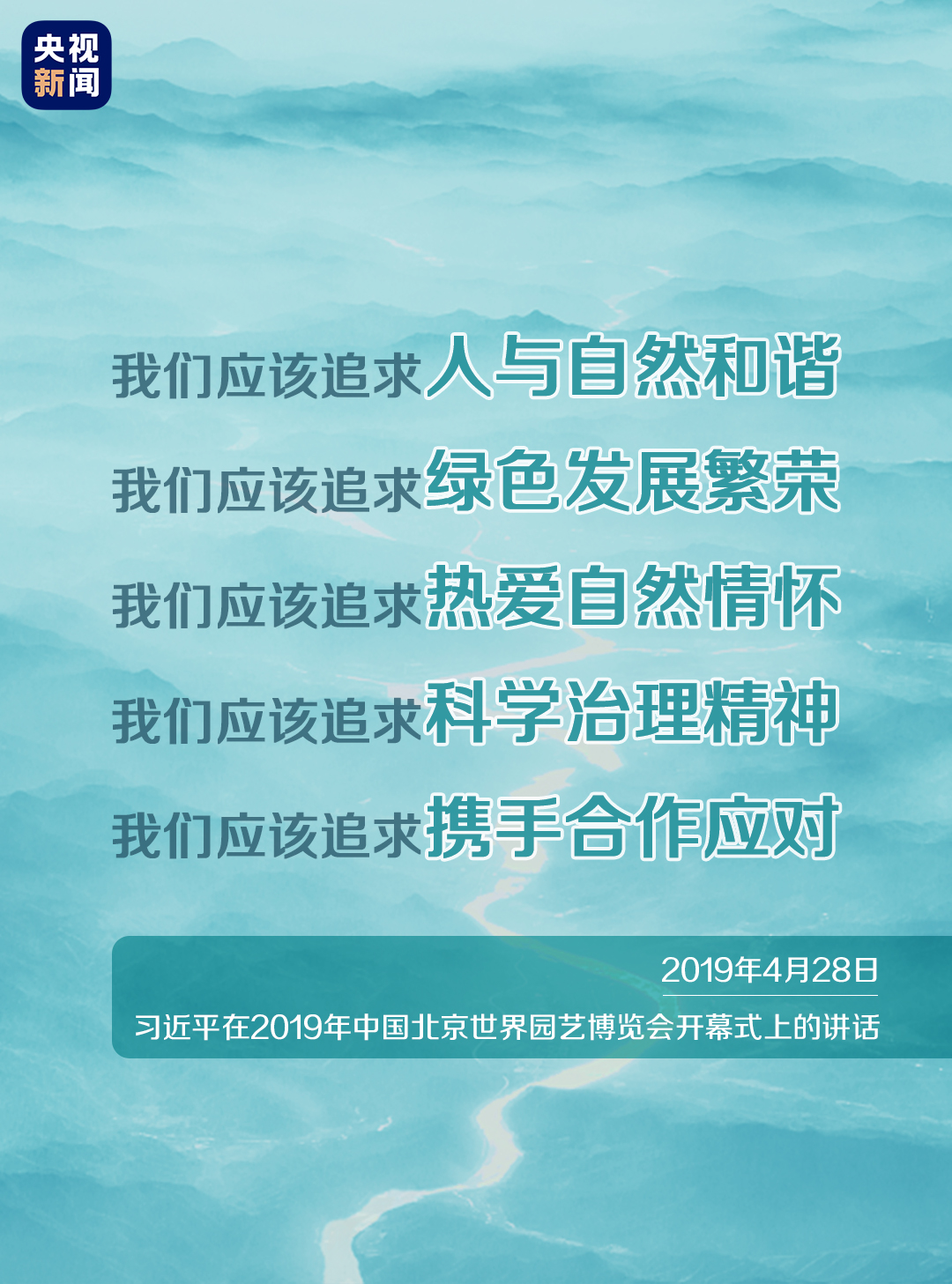 2019年6月5日,世界环境日全球主场活动在浙江省杭州市举行,习近平主席致贺信。习近平指出,人类只有一个地球,保护生态环境、推动可持续发展是各国的共同责任。建设全球生态文明,需要各国齐心协力,共同促进绿色、低碳、可持续发展。 从3月底4月初在浙江考察时调研安吉、西溪湿地,到4月下旬在陕西考察时深入秦岭,再到5月中旬在汾河太原城区晋阳桥段考察,习近平总书记的考察行程和重要指示,一再宣示生态文明建设是关系中华民族永续发展的根本大计。 面向未来,中国也愿同各国一道,共同建设美丽地球家园,共同构建人类命运共同体。