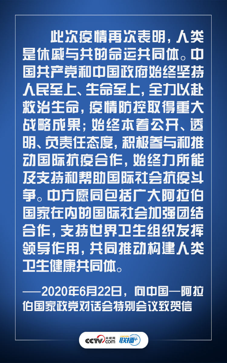 联播+ 6月22日,中国—阿拉伯国家政党对话会特别会议以视频会议方式召开,习近平主席向会议致贺信。 习近平指出,中阿友谊源远流长,历久弥新。中阿两大民族在古丝绸之路上出入相友,在共建“一带一路”中携手相伴,共同致力于实现国家富强、民族复兴梦想。面对突如其来的新冠肺炎疫情,中阿守望相助、共克时艰,谱写了共建中阿命运共同体的新篇章。 新冠肺炎疫情发生以来,习近平主席始终秉持人类命运共同体理念,以元首外交统领抗疫外交,以领袖担当推动国际合作,开启了以电话、书信、视频为主渠道的“云外交”模式。 “我赞赏你提出的人类命运共同体理念,赞同支持世卫组织为国际抗疫合作发挥领导作用。”“塔方愿同中方一道,携手推动构建人类命运共同体。”“我完全赞同习近平主席所说,这次疫情表明构建人类命运共同体十分重要。”……在全球携手抗疫的过程中,“人类命运共同体”理念得到了国际社会的高度认可。 央视网《联播+》栏目特梳理习近平主席的深入阐述,与您一起学习感悟这一重要理念。
