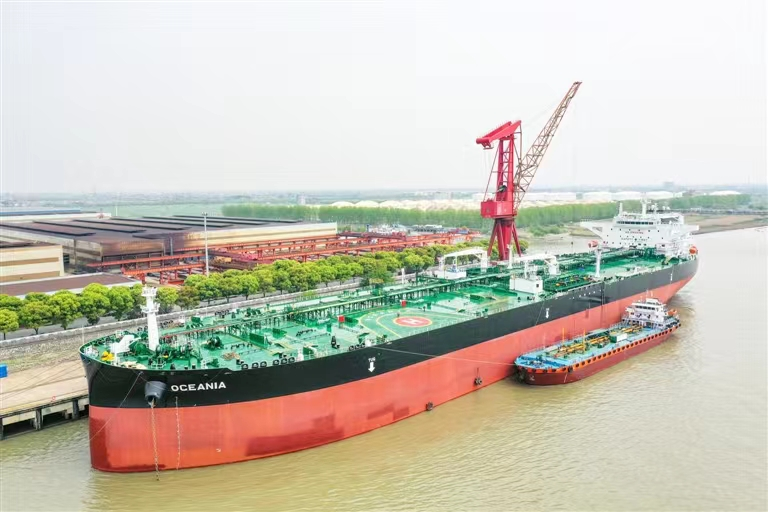 (图为16.3万吨油轮交付现场) 在严格落实疫情防控措施的前提下,靖江市积极帮助新时代造船、新扬子造船等企业办理外籍人士来靖申请,解决了企业的燃眉之急。靖江海关在加工贸易手册备案、延期、核销等方面提供政策支持,进口通关环节应用“提前申报”,叠加“两步申报”,全程实现电子化,提高通关效率。“在海关的指导帮助下,我们的一批船舶备件通过靖江保税物流中心(B型)报关,成功发货至企业,保证了后续的生产。”新时代造船物资部副部长毛建告诉记者。通过推广使用“互联网+”和目的地查验新模式,靖江海关实现造船原料“即到、即验、即放”,为企业新船出口提速加码。南京海关所属靖江海关副关长杨强介绍,今年以来,靖江地区造船企业已经顺利交付出口船舶18艘,与去年同期相比增长12.5%。