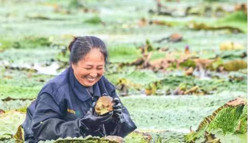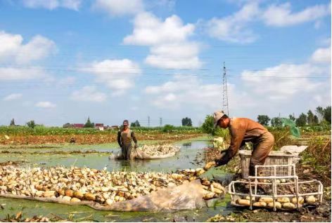 姜堰自古以来江水、淮水、海水在这里交汇,是因水而兴的城市。当下类似俞建林的“织梦人”还有很多,菱角、莲藕、水芹菜等水生植物的种植成了他们向幸福进发的利器。顾高镇的大片藕塘里,胖胖的莲藕被农户们从淤泥里拔出,经过清洗加工销往江浙沪等地。夏庄村党总支副书记许玲说:个头大、皮色白、口感甜且没有土腥味儿,每天的采摘量约3万斤左右,还有不少外地客商前来收购。目前,每斤能卖到5至6元,每亩利润可达到5000元。 在俞垛镇菱叶铺满池塘,宛如一块块绿毯,农户们穿梭其间采摘菱角。“水天堂”里,农民跳起了多彩多姿的“丰收舞”,唱响了新时代幸福的赞歌。