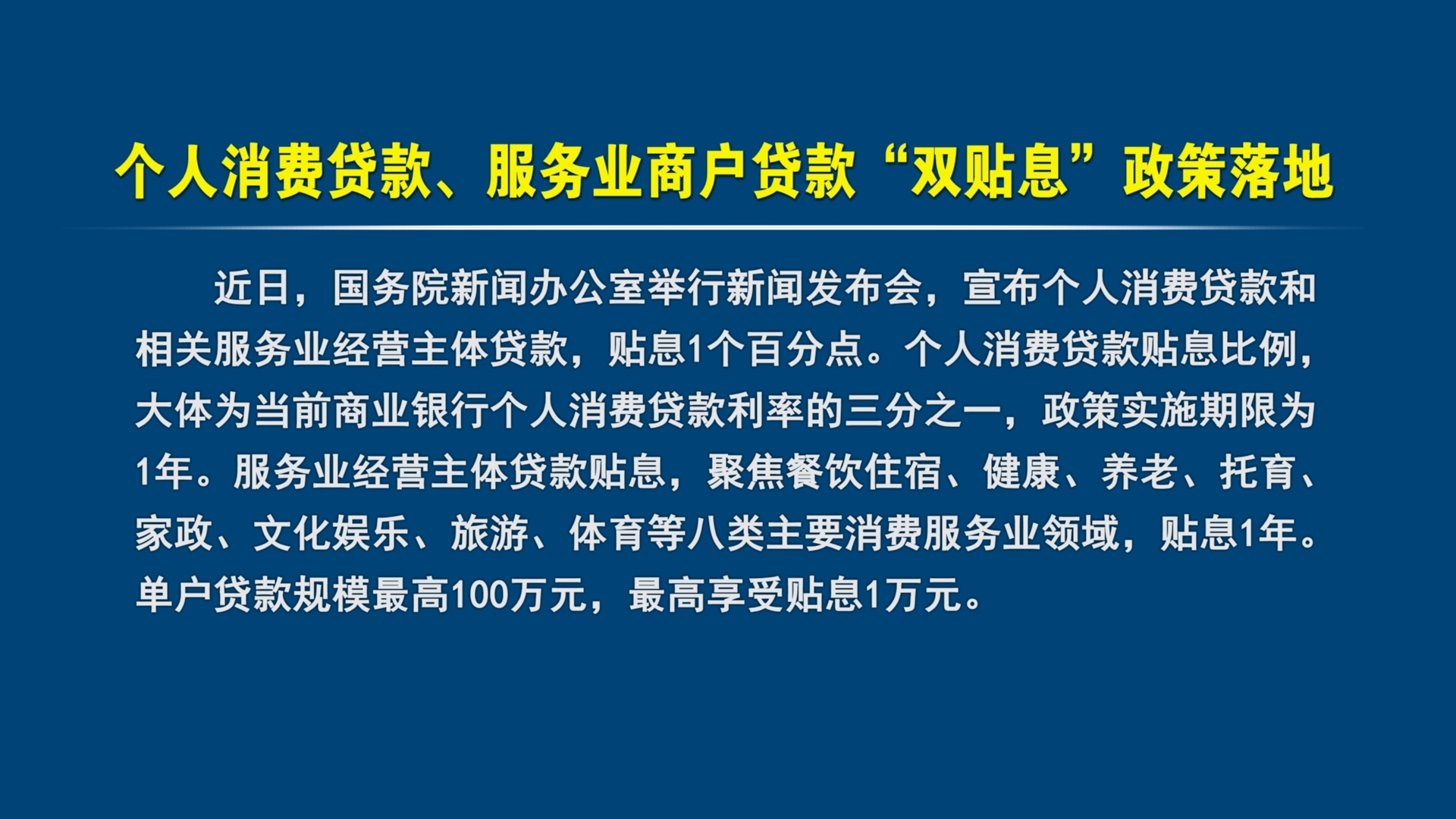 近日,国务院新闻办公室举行新闻发布会,宣布对个人消费贷款和相关服务业经营主体贷款实施贴息,贴息比例为1个百分点。
