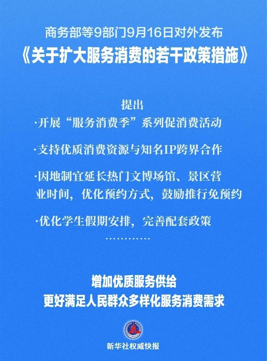 商务部等9部门9月16日对外发布《关于扩大服务消费的若干政策措施》,提出五方面19条举措。其中优化学生假期安排,完善配套政策中提到,在放假总天数和教学时间总量保持不变的情况下,鼓励有条件的地方结合气候条件、生产安排、职工带薪休假制度落实等因素,科学调整每学年的教学和放假时间,探索设置中小学春秋假,相应缩短寒暑假时间,增加旅游出行等服务消费时间。 以下为全文 服务消费是促进民生改善的重要支撑,也是消费转型升级的重要方向,在推动经济高质量发展中发挥重要作用。为贯彻落实党中央、国务院决策部署,更大力度提振消费、扩大内需,提出以下措施。 01培育服务消费促进平台 (一)实施服务消费提质惠民行动。印发《服务消费提质惠民行动工作方案》,从加强政策支持、搭建平台载体、扩大对外开放、强化标准引领、优化消费环境等方面提出工作举措。持续深化“购在中国”品牌打造,开展“服务消费季”系列促消费活动,围绕贴近群众生活、需求潜力大、带动作用强的重点领域开展服务消费促进活动,培育服务消费品牌,打造服务消费热点。(商务部牵头) (二)开展消费新业态新模式新场景试点城市建设。积极发展首发经济,推动创新和丰富服务消费场景,支持优质消费资源与知名IP跨界合作,打造一批商旅文体健融合的消费新场景,培育一批新型消费龙头企业。(财政部、商务部按职责分工负责) 02丰富高品质服务供给 (三)扩大服务业高水平对外开放。推动互联网、文化等领域有序开放,扩大电信、医疗、教育等领域开放试点。加快推进服务业扩大开放综合试点示范。支持将更多服务消费领域纳入《鼓励外商投资产业目录》,提供差异化服务供给。(中央宣传部、国家发展改革委、教育部、工业和信息化部、商务部、文化和旅游部、国家卫生健康委按职责分工负责) (四)统筹利用现有资金渠道,支持推出一批文学、艺术、影视、动漫等领域精品创作,充分利用已有场馆,打造一批辐射带动作用强的剧场、博物馆、美术馆、科技馆,培育一批群众性文化活动和赛事品牌,优化文化产品和服务供给。支持世界文化遗产、文博场馆、非遗机构、历史文化名城,挖掘传统文化IP市场价值,打造服务消费新场景。支持有条件的地方以优质演艺、动漫、游戏、影视作品等线上流量带动线下场景创新。(党委宣传、财政、商务、文化和旅游、广电、文物主管部门按职责分工负责) (五)结合实际、因地制宜延长热门文博场馆、景区营业时间,优化预约方式,鼓励推行免预约。支持文博场馆创新办展方式,其收益可按规定用于绩效激励,根据工作成效合理核定绩效工资总量。鼓励文博单位开放馆藏资源,与社会力量合作开发文创、数字产品,推动市场化方式举办的各类文化展览进商场、进社区、进公园。(财政、人力资源社会保障、商务、文化和旅游、文物主管部门按职责分工负责) (六)鼓励引进国外优秀体育赛事,支持地方举办大众体育赛事,打造一批具有较高知名度的精品赛事、职业联赛以及具有自主知识产权的体育竞赛表演品牌。持续开展“跟着赛事去旅行”“体育赛事进景区、进街区、进商圈”“乐享精彩赛事 寻味中华美食”等活动,发挥体育赛事和相关活动带动效应。(商务、文化和旅游、体育主管部门按职责分工负责) (七)培育多元化教育和培训市场。规范发展文化艺术、科技、体育类非学科教育培训,完善许可条件,符合条件的线上、线下非学科类培训机构可依法依规申请行政许可。鼓励相关机构以市场化为导向开展职业技能培训,完善培训评价机制。有序发展社区学院、市民夜校、老年培训,提供优质技能培训、文化艺术培训,鼓励有条件的地方提供免费或低租金场地设施。(教育、科技、民政、人力资源社会保障、体育主管部门按职责分工负责) (八)加快推进长期护理保险制度建设,扩大长期护理保险制度覆盖面。加强对养老护理、家政服务、长期照护等领域从业人员培养培训,落实有关支持政策。开展家政服务职业技能专项培训行动,完善以职业能力为导向的家政服务职业评价体系,引导家政企业开展岗前培训、企业新型学徒制培训、技师培训等。(教育、财政、民政、人力资源社会保障、商务、医保主管部门,工会、妇联按职责分工负责) (九)有条件的地方可结合实际对普惠托育机构给予场地支持和适当运营补助。支持有条件的幼儿园招收2—3岁幼儿,发展社区嵌入式托育、家庭托育点,鼓励用人单位提供托育服务,并按相关规定给予政策支持。(发展改革、教育、财政、卫生健康主管部门,工会按职责分工负责) (十)放宽中高端医疗、休闲度假等领域市场准入,减少限制性措施,吸引更多外商投资、民营资本进入,增加优质服务供给。(商务部、文化和旅游部、国家卫生健康委按职责分工负责) 03激发服务消费新增量 ( 十一)吸引更多境外人员入境消费。有序扩大单方面免签国家范围,优化完善区域性入境免签政策,持续优化外国人来华签证政策和通讯、住宿、支付等便利化措施,为更多符合条件的人员签发5年多次签证。加强我国文旅资源国际宣传推广,发挥美食、中医药、文物古迹等传统文化资源优势,鼓励旅行社、在线旅游平台推出若干适合外国人的特色旅游线路。加强“留学中国”品牌建设,吸引外国优秀学生来华学习。
