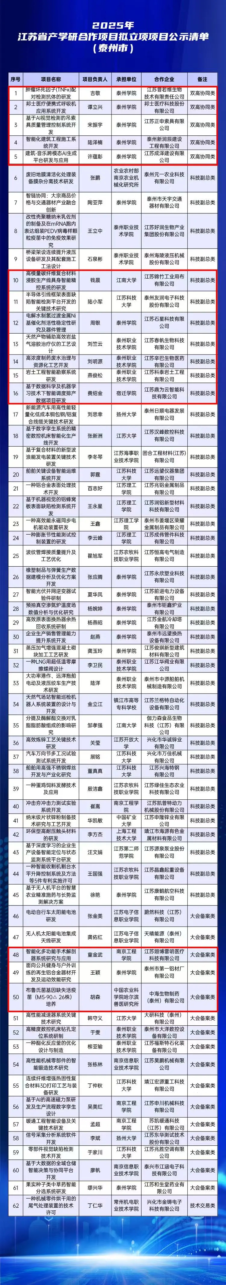 近日省科学技术厅公示2025年江苏省产学研合作项目拟立项项目我区15个项目成功入选入选数位居全市前列(可上下滑动查看)此次入选的项目聚焦生物医药、人工智能应用、新材料和电子信息多个领域,其中,科技副总类7项、双高协同类5项、大会备案类3项,总数占全市四分之[详细]