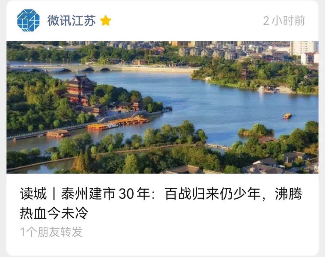1月9日微讯江苏公众号以《百战归来仍少年,沸腾热血今未冷》为题关注泰州建市30年一起来看看& 8203;[详细]